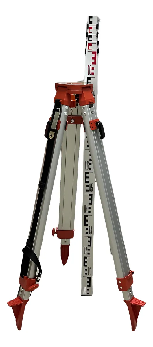 El trípode cuenta con una estructura de aluminio robusta, ideal para condiciones exigentes de trabajo diario. Gracias a su sistema de cierre rápido, las patas pueden extenderse y fijarse fácilmente, lo que agiliza el montaje y desmontaje en campo. Además, incorpora una correa de transporte para mayor comodidad.