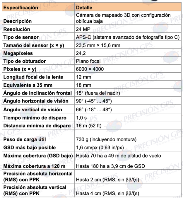 Precisión absoluta (sin GCPs): horizontal de hasta 2 cm, vertical de 4 cm con GNSS PPK.